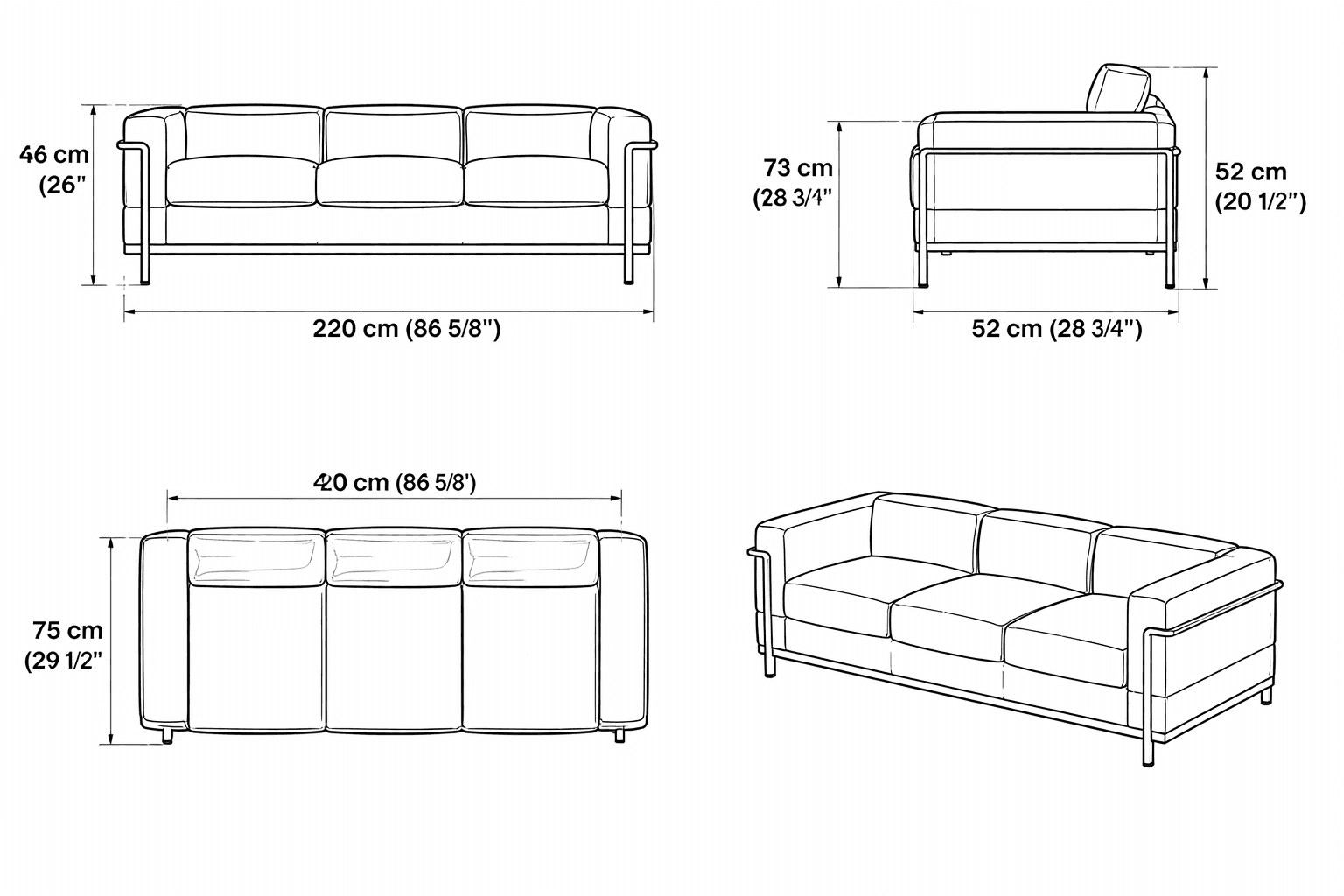 This sofa combines soft leather cushions with an exposed metal frame, creating a refined balance between comfort and structure. Its proportions feel calm, grounded, and architectural, making it ideal for living rooms, studios, and open-plan interiors.