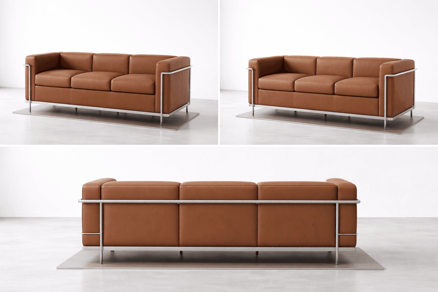 A three-seat leather sofa with a steel frame. Timeless form, clear structure, made for modern interiors.